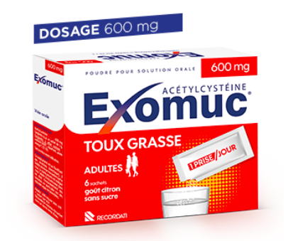 Exomuc® 600 mg, poudre pour solution orale en sachet. Ce médicament est un fluidifiant des sécrétions bronchiques, il facilite ainsi leur évacuation par la toux. Réservé à l’adulte, il est préconisé dans les états d’encombrement des bronches en particulier lors des épisodes aigus de bronchites. Pour